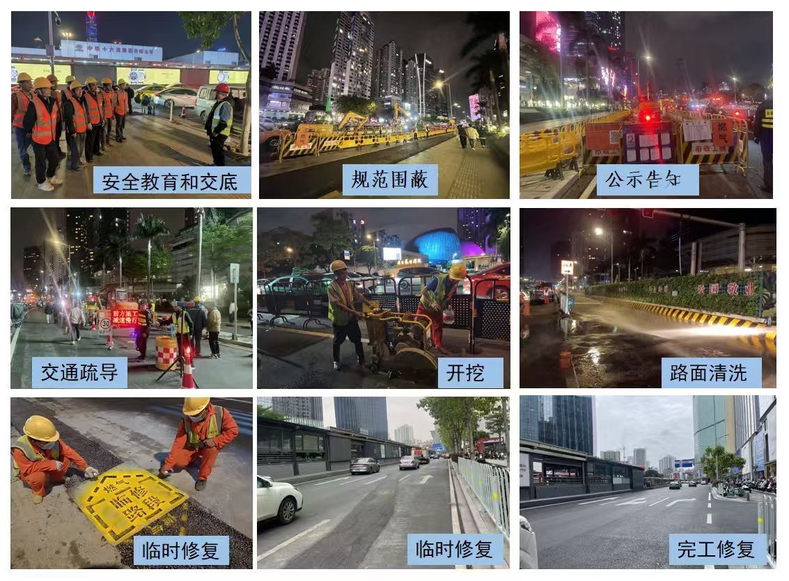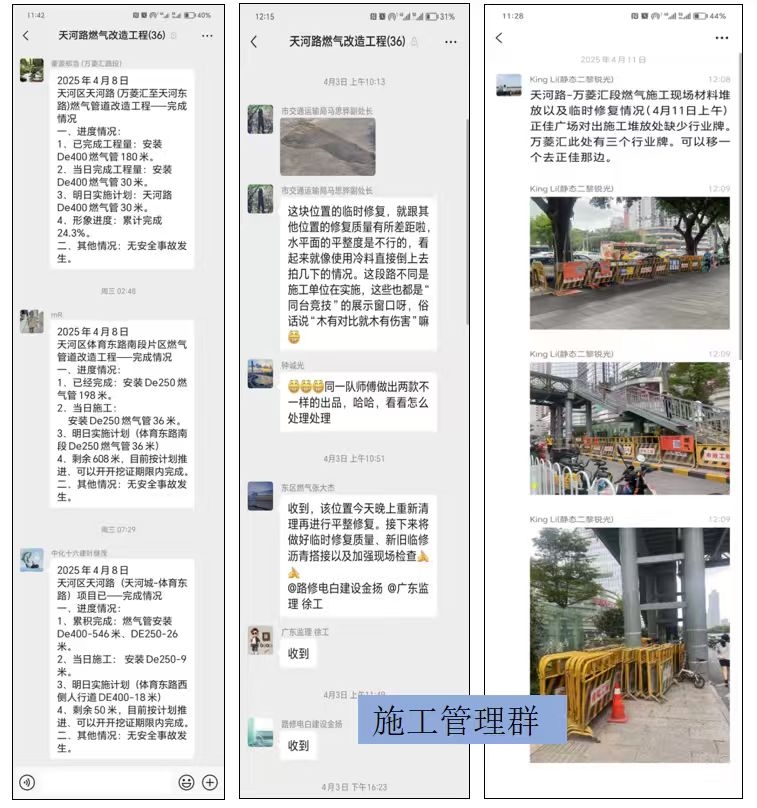 ??为减少施工对城市交通和市民生活产生影响,施工安排在夜间进行(晚22点至翌日6点),6点前开挖、铺管、回填和临时沥青路面修复,结束后施工机具从现场拉走,白天恢复交通通行并进行检查、复盘。施工管理首次采用夜间值班制,由2名青年党员和2名共青团员组成“2+2”青年工程管理小组,对夜间施工作业现场轮守,巡检值班。“今晚计划下管24米”“开始围蔽”“开始管沟开挖”“今天现场施工完成18米”……各项目施工管理群,每天施工路段、施工计划、施工时间和作业工序等各种进展信息、照片和视频实时更新,反映问题和求援求助,反馈快处置更快。5个工程的实施过程中,每个环节管控有效、衔接有序、零纰漏。