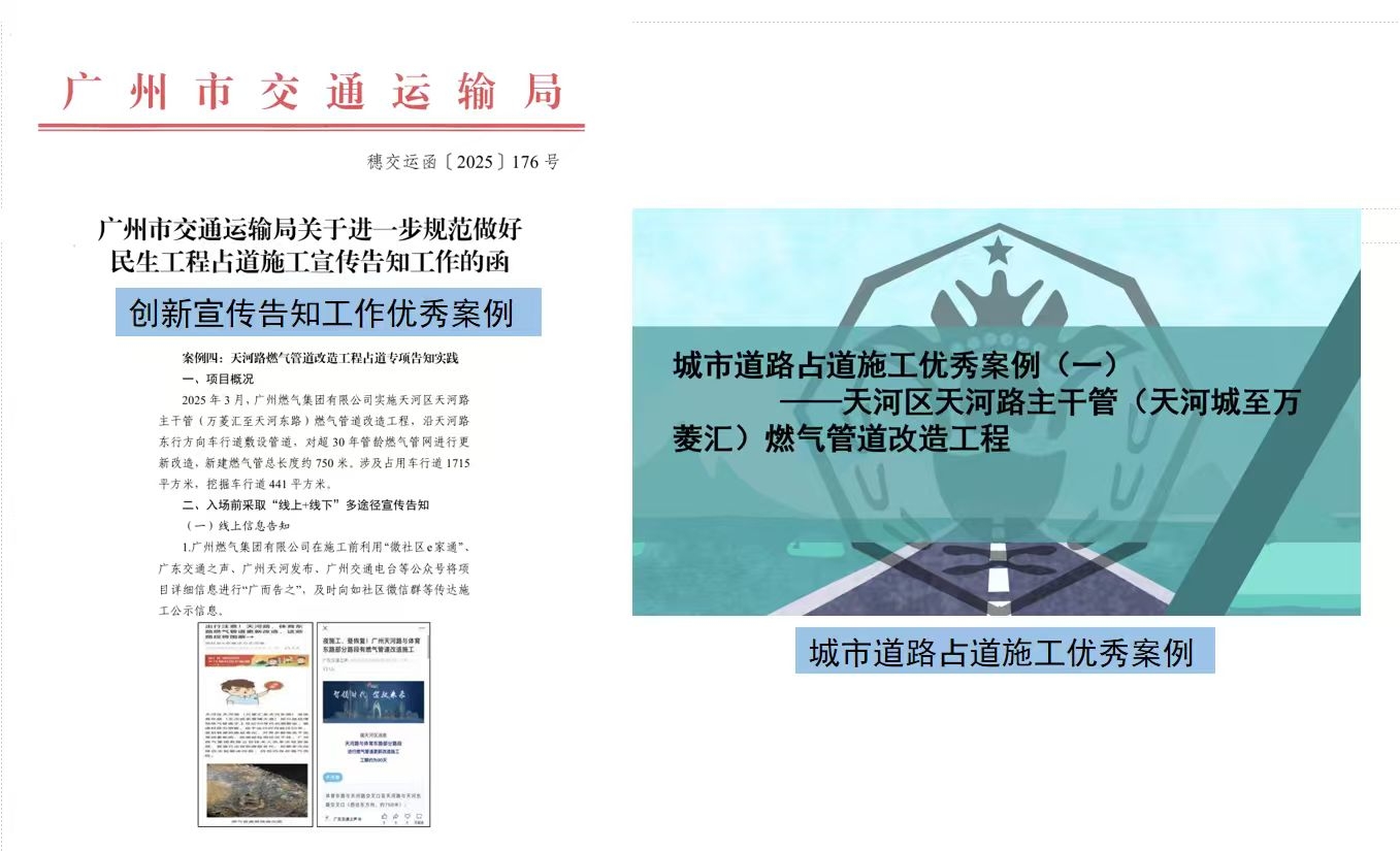 ?天河区天河路(天河城至万菱汇)燃气管道改造工程获得广州市交通运输局通报